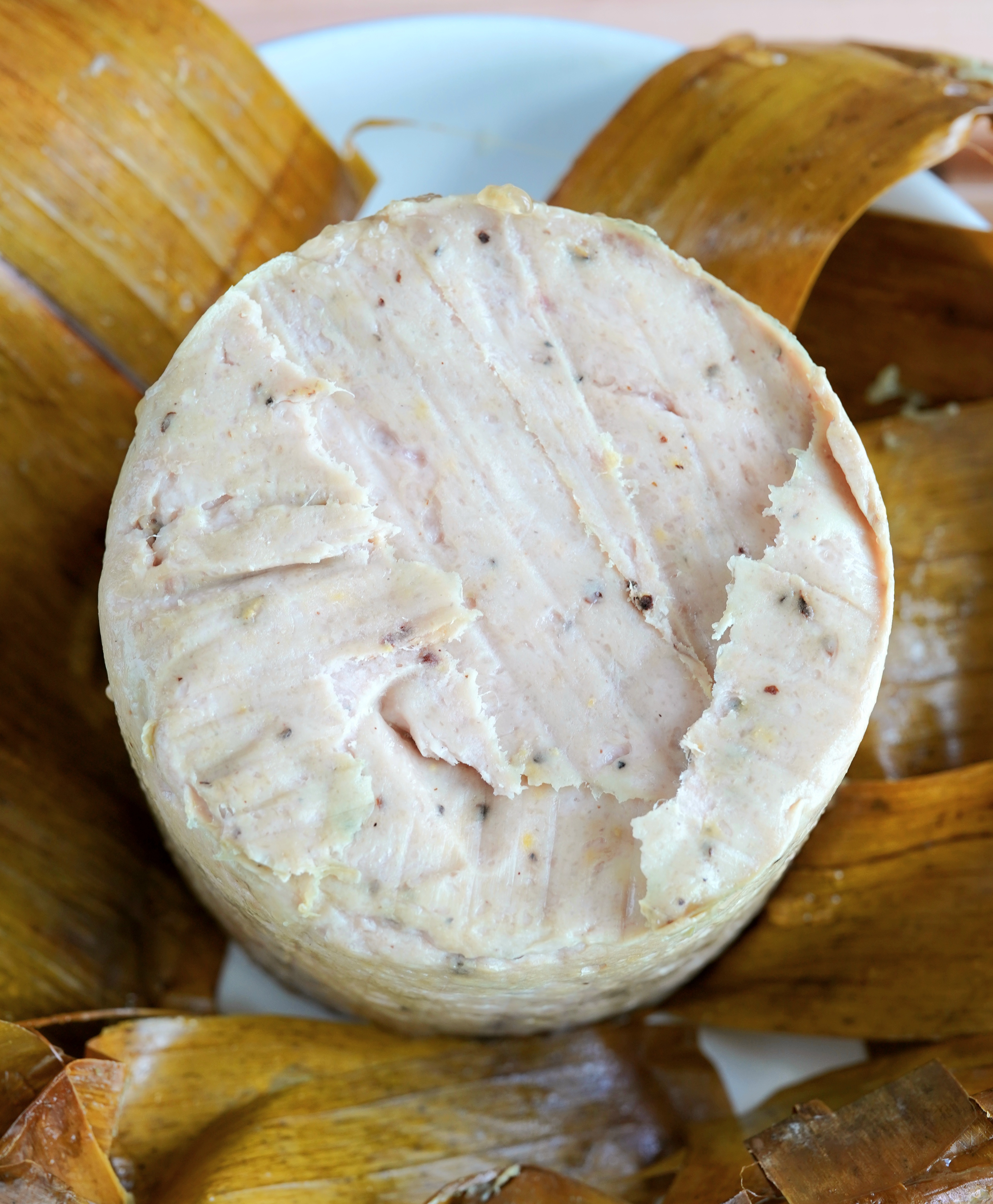 以上圖片是將肉糊放入用做火腿器皿中慢煮而成,相比直接捲起蒸會結實一點。不過以上那份扎肉卷做得不好,原因是將肉放室溫後忙記了,肉粒完全溶雪,肉中心不夠冰硬下照樣攪拌。做出來的扎肉肉質不夠幼細,這些都是攪拌期間,機器熱力造成的,所以必須在肉半溶雪下攪拌成肉糊啊!
