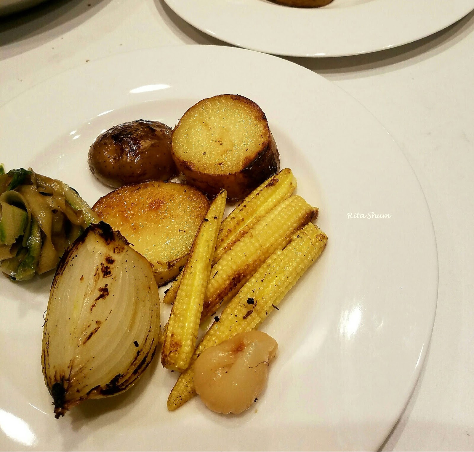 7. 同時取出蔬菜,把洋蔥切四份,薯仔切厚片跟粟米仔放上鐵pan煎至焦香。一半蒜頭去皮放上碟,另外用4粒蒜壓蓉。